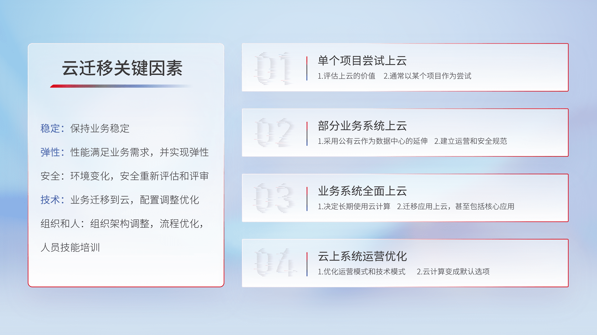 结合实际业务,,,,从规划设计、、、云平台选型、、、、云原生改造、、、数据迁移、、、、集成交付,,,迁移全过程为客户识别最佳上云路径,,做好风险识别管理,,设计网络架构、、、身份权限、、安全审计合规、、、、操作审计、、、、日志审计、、、、监控告警策略、、、多站点容灾设计等,,,对云上基础设施进行整体规划,,提升IT治理水平,,,,以满足弹性、、高可用、、、、高性能的需求。。。