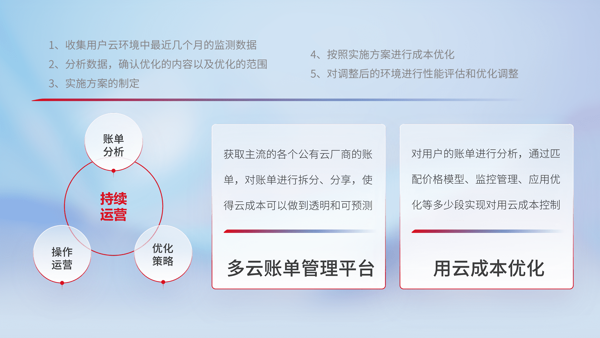 通过灵活运用多种自动化迁移工具,,,帮助企业用户实现业务和数据高效 、、稳定的上云迁移和云上迁移,,,采用自研多云纳管平台,,,,以中立管理模式,,,,解决多组织、、、、多云、、、、多运维厂商的复杂关系的管理,,,,保证多云平台资源配置的一致性,,实时掌控云资源运行数据,,,,运用智能化工具分析云资源多云平台的管理服务,,,透明化管理成本支出,,,,用云成本可预测、、、、用云费用可优化、、云资源配额有据可依。。